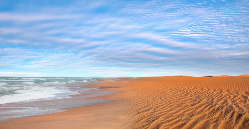 Die Sanddünen der Namib-Wüste, die auf die endlose Weite des Atlantiks treffen, bilden vermutlich den schönsten und außergewöhnlichsten Strand in Namibia.