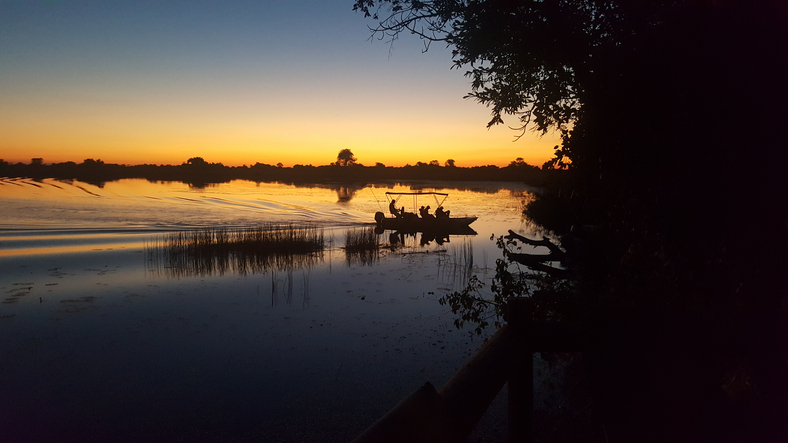 Auf den ersten Abend freute ich mich ganz besonders, denn wir hatten eine Bootsfahrt im Sonnenuntergang geplant. Auf der einstündigen Sundowner Cruise auf dem Boro Fluss, einem Arm des Okavango Deltas, tauchten wir das erste mal ein in die unglaubliche Tier- und Pflanzenwelt. Es war magisch. Das warme Licht, das alles in Gold tunkte, der Duft von Fluss und Schilf. Ein Moment, der mir sofort klar machte: Botswana ist entschleunigend. Sie verlassen den Alltag sofort. Halten Sie die Augen offen – schon hier können Sie eine Vielzahl von Vögeln beobachten und natürlich: das erste Krokodil meines Lebens, das faul am Ufer lag. Ein perfekter Auftakt, um sich auf die reiche Tierwelt einzustimmen!