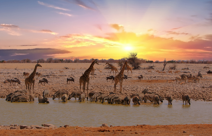 Der Nationalpark ist Heimat von über 340 Vogelarten sowie zahlreicher Säugetiere. Entlang der zahlreichen Wasserlöcher versammeln sich Elefanten, Zebras, Giraffen, Antilopen und – mit etwas Glück – auch die seltenen Spitzmaulnashörner. Löwen und Leoparden halten sich im Schatten der Büsche und bieten immer wieder spannende Beobachtungen. Ob in den frühen Morgenstunden oder bei Sonnenuntergang: Die Tierwelt ist in Etosha allgegenwärtig und ganz nah.