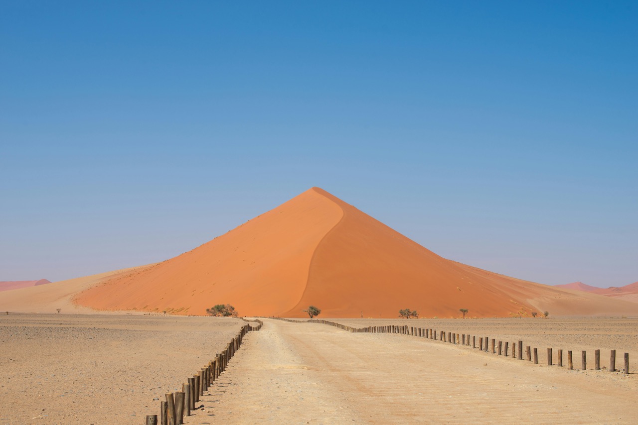 Sossusvlei liegt im Herzen der Namib-Wüste und ist bekannt für seine imposanten, bis zu 300 Meter hohen Sanddünen, die zu den höchsten der Welt zählen. Die orangefarbenen Dünen, besonders "Dune 45" und "Big Daddy", bieten spektakuläre Ausblicke auf Namibias Wüste und sind ein beliebtes Ziel für Fotografen. In der Nähe liegt das Deadvlei, ein ausgetrocknetes, von toten Kameldornbäumen gesäumtes Becken, das eine einzigartige, fast mystische Atmosphäre schafft. Die Wüstenlandschaften in Sossusvlei sind nicht nur beeindruckend, sondern auch Heimat zahlreicher Tierarten, die sich den extremen Bedingungen angepasst haben.