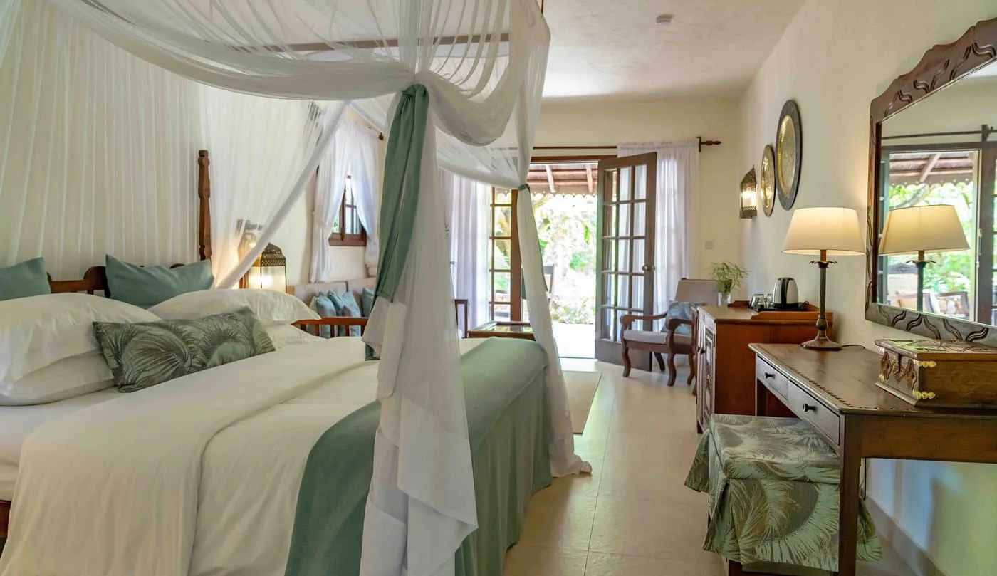 Der Breezes Beach Club & Spa verfügt über 74 geschmackvoll eingerichtete Zimmer und Suiten, die den Charme Sansibars mit modernem Komfort verbinden. Alle Unterkünfte sind mit lokalen Holzschnitzereien dekoriert und in warmen Naturtönen gehalten, was ein behagliches Ambiente schafft.