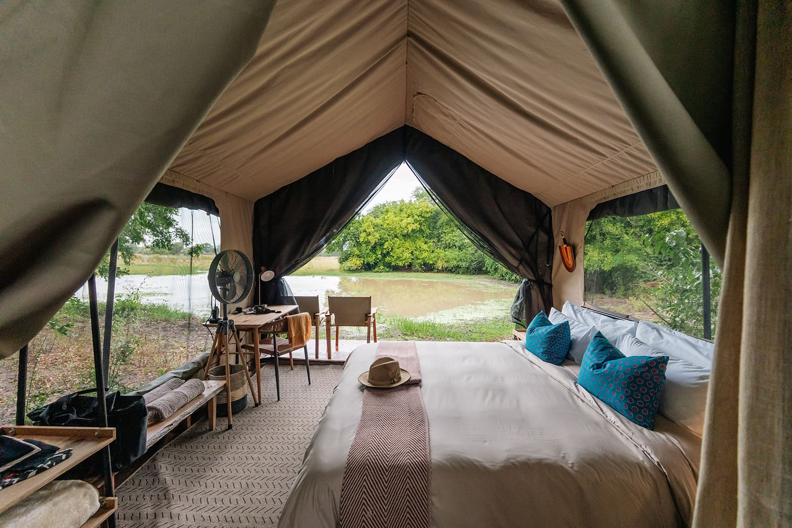 - 8 Safari-Zelte: Diese geräumigen Zelte verfügen über ein eigenes Badezimmer (En-suite) und sind so positioniert, dass sie maximale Privatsphäre bieten. Jedes Zelt hat eine private Veranda mit direktem Blick auf die Wasserstelle – ein Logenplatz für die Beobachtung von Tieren beim Trinken und Baden.