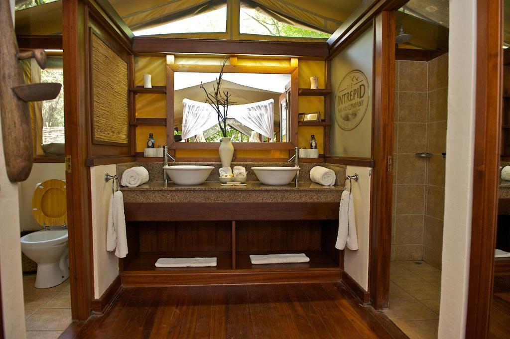- Zeltchalets: Die Zelte sind im klassischen Safari-Stil mit dunklen Holzmöbeln und afrikanischen Designelementen eingerichtet. Zur Ausstattung gehören große Himmelbetten mit Moskitonetzen, ein Schreibtisch, eine Minibar sowie ein eigenes Badezimmer mit Doppelwaschbecken und Warmwasserdusche.