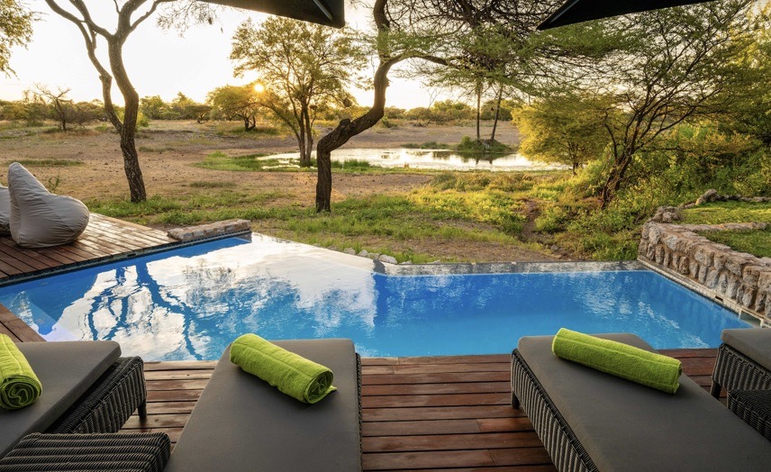 - Privatsphäre: Große Fensterfronten und private Decks bieten einen ungestörten Blick auf den Busch und das Wasserloch.